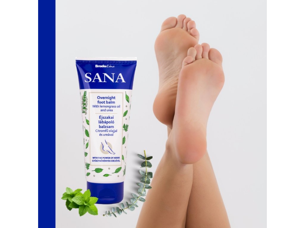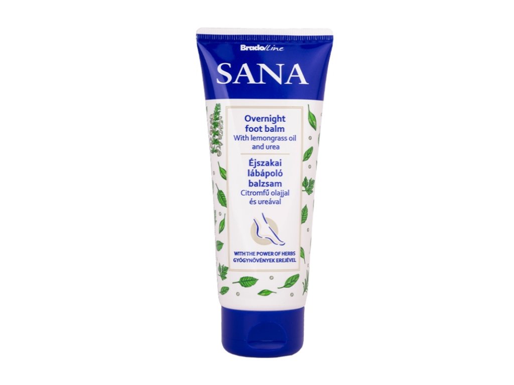 SANA nočný balzam s Urea a Citrónovou trávou pre regeneráciu pokožky nôh počas spánku.